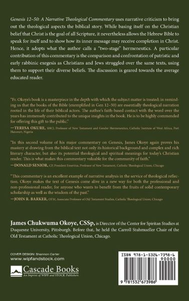 Genesis 12-50: A Narrative-Theological Commentary uses narrative criticism to bring out the theological aspects of the biblical story. While basing itself on the Christian belief that Christ is the goal of all Scripture, it nevertheless allows the Hebrew Bible to speak for itself and to show how its inner message may receive completion in Christ. Hence, it adopts what the author calls a "two-stage" hermeneutics. A particular contribution of this commentary is the comparison and confrontation of patristic and early rabbinic exegesis as Christians and Jews struggled over the same texts, using them to support their diverse beliefs. The discussion is geared towards the average educated reader.