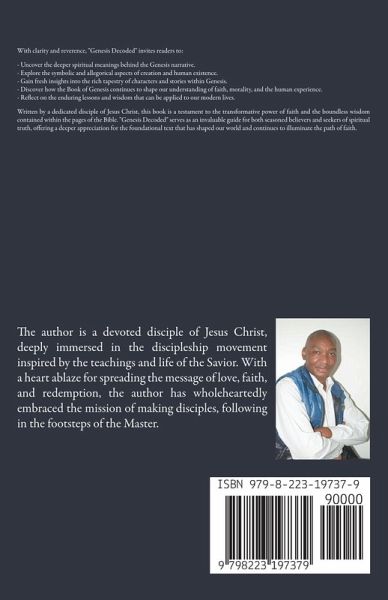 "Genesis Decoded: Unveiling the Mysteries of the First Book of the Bible" In "Genesis Decoded," embark on a profound journey of spiritual exploration and biblical understanding as we delve into the timeless wisdom and mysteries of the Book of Genesis. This captivating and enlightening work invites readers to uncover the profound depths of this foundational scripture, shedding light on its hidden truths and timeless relevance. As we journey through the pages of "Genesis Decoded," readers will encounter a comprehensive exploration of the creation narrative, the origins of humanity, and the divine covenant. Through meticulous research, insightful exegesis, and a passionate commitment to faith, this book offers a fresh perspective on the age-old questions that have intrigued and inspired generations. With clarity and reverence, "Genesis Decoded" invites readers to: - Uncover the deeper spiritual meanings behind the Genesis narrative. - Explore the symbolic and allegorical aspects of creation and human existence. - Gain fresh insights into the rich tapestry of characters and stories within Genesis. - Discover how the Book of Genesis continues to shape our understanding of faith, morality, and the human experience. - Reflect on the enduring lessons and wisdom that can be applied to our modern lives. Written by a dedicated disciple of Jesus Christ, this book is a testament to the transformative power of faith and the boundless wisdom contained within the pages of the Bible. "Genesis Decoded" serves as an invaluable guide for both seasoned believers and seekers of spiritual truth, offering a deeper appreciation for the foundational text that has shaped our world and continues to illuminate the path of faith.