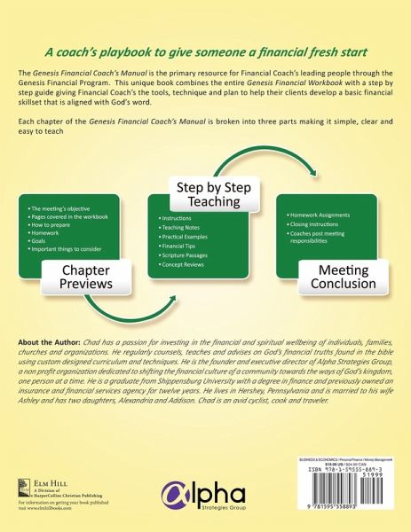 The Genesis Financial Coach's Manual is the primary resource for Financial Coach's leading people through the Genesis Financial Program. It combines the entire Genesis Financial Workbook with a step by step guide giving Financial Coach's the tools, techniques and plan to help their clients develop a basic financial skillset aligned with God's word.
