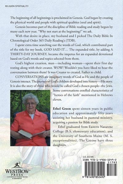 The beginning of all beginnings is proclaimed in Genesis. God began by creating the physical world and people with spiritual qualities (soul and spirit). Genesis becomes part of the discipline of Bible reading and study begun by many each new year. "Why not start at the beginning?" we ask. With that desire in place, my husband and I picked The Daily Bible In Chronological Order 365 Daily Reading's (TDB). I spent extra time searching out the words of God, which contributed part of the title for my book, GOD SAID IT... The expanded title, by adding A THIRTY-DAY JOURNEY, became the impetus for an expanded devotional based on God's words and topics selected from them. God's highest creation, man--including woman--spent their first day resting along with their creator. WOW! Wouldn't you have liked to hear the conversation between them? It was Creator to created, Father to child. CONVERSATIONS are imaginary words of God as He and the people of Genesis interact. The journey of God's children developed into history-His story. It is also the story of those who would be called God's chosen people--the Jews. Some conversations extolled characteristics of "heroes of the faith" mentioned in Hebrews eleven.