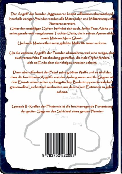 Santara liegt in Schutt und Asche!Der Angriff der fremden Aggressoren kam vollkommen überraschend. Innerhalb weniger Stunden werden alle Metropolen und wichtigen Militärstützpunkte des Planeten zerstört. Unter den unzähligen Opfern befinden sich auch Joriks Frau Alisha und seine erst neugeborene Tochter Daria, die in seinen Armen stirbt, sowie Marivars Mann Glowin. Und auch Mavis glaubt seine geliebte Melia für immer verloren.Um die anhaltenden Angriffe der Fremden abzuwehren, wird eine mutige, aber auch verzweifelte Entscheidung getroffen, die viele Opfer fordert, sich am Ende aber als richtig zu erweisen scheint.Dann aber offenbart der Feind seine größte Waffe und es wird klar, dass die furchtbaren Angriffe erst der Anfang waren und ihr Gegner mit dem Einsatz seiner schier apokalyptischen Bodentruppen ein wahrhaft grauenvolles Leichentuch ausbreitet, vor dem es kein Entrinnen zu geben scheint.Genesis II - Krallen der Finsternis ist die furchterregende Fortsetzung der großen Saga um das Schicksal eines ganzen Planeten.