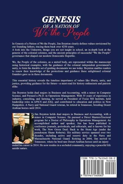 In Genesis of a Nation of We the People, Jim Boynton clearly defines values envisioned by our founding fathers, tracing them back over 4250 years .A look into the Unknown, things you are not taught in school, an in-depth look at the genesis of the colonial colonies, and the ancient principles of successful "We the People" governance that shaped our modern Democratic Republic. We, the People of the colonies, as a united body, are represented within the manuscript using historical examples, with the guidance of the colonial independent government's unity, to form the durable set of guiding documents we use today. Boynton enables readers to renew their knowledge of the protections and guidance these enlightened colonial founders gave us in these documents. This essential history reveals the timeless importance of values like liberty, unity, and justice, providing guidance for the future-a must-read for history enthusiasts and patriots alike. Jim Boynton holds dual majors in Business and Accounting, with a minor in Computer Science, and Persued a Ph.D. in Operations Management. With 55 years of experience in industry, consulting, and farming, he served as President of Focus NH Institute, held leadership roles in APICS and ASQ, and contributed to education and politics in New Hampshire. A Navy and National Guard veteran, he retired in Tennessee, breeding Desert Arabian horses until 2014.