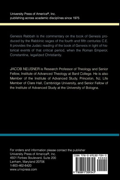 Genesis Rabbah is the commentary on the book of Genesis produced by the Rabbinic sages of the fourth and fifth centuries C.E. It provides the Judaic reading of the book of Genesis in light of historical events of that critical period, when the Roman Emperor, Constantine, legalized Christianity.