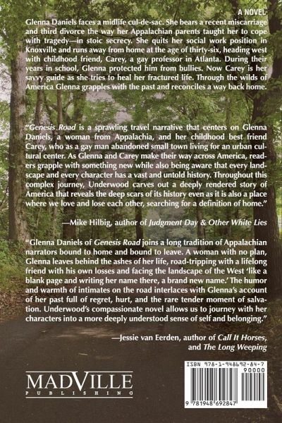 Glenna Daniels faces a midlife cul-de-sac. She bears a recent miscarriage and third divorce the way her Appalachian parents taught her to cope with tragedy-in stoic secrecy. She quits her social work position in Knoxville and runs away from home at the age of thirty-six, heading west with childhood friend, Carey, a gay professor in Atlanta. During their years in school, Glenna protected him from bullies. Now Carey is her savvy guide as she tries to heal her fractured life. Through the wilds of America Glenna grapples with the past and reconciles a way back home.