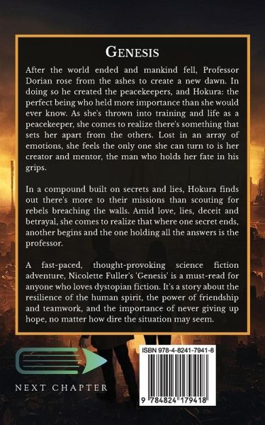 After the world ended and mankind fell, Professor Dorian rose from the ashes to create a new dawn. In doing so he created the peacekeepers, and Hokura: the perfect being who held more importance than she would ever know. As she's thrown into training and life as a peacekeeper, she comes to realize there's something that sets her apart from the others. Lost in an array of emotions, she feels the only one she can turn to is her creator and mentor, the man who holds her fate in his grips. In a compound built on secrets and lies, Hokura finds out there's more to their missions than scouting for rebels breaching the walls. Amid love, lies, deceit and betrayal, she comes to realize that where one secret ends, another begins and the one holding all the answers is the professor. A fast-paced, thought-provoking science fiction adventure, Nicolette Fuller's 'Genesis' is a must-read for anyone who loves dystopian fiction. It's a story about the resilience of the human spirit, the power of friendship and teamwork, and the importance of never giving up hope, no matter how dire the situation may seem.