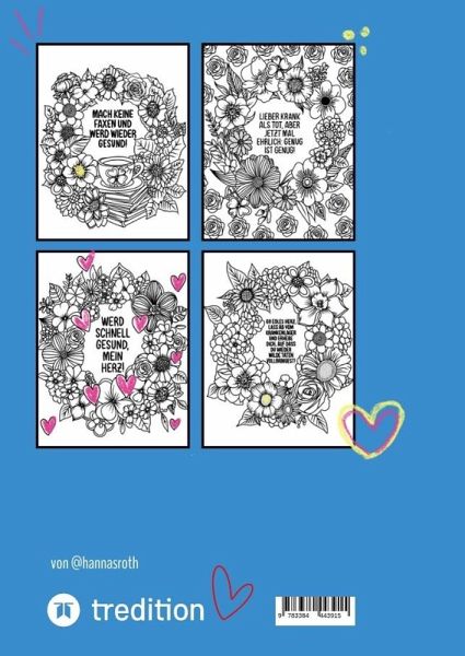 Dieses, doch sehr besondere Malbuch, kombiniert liebevolle (naja und freche) Botschaften mit wunderschönen Blumenkränzen, die darauf warten, ausgemalt zu werden. Ob die kranke Person selbst zum Stift greift oder du das Malen übernimmst und ein individuelles Geschenk gestaltest - dieses Malbuch ist eine MEGA Alternative zur klassischen Karte (denn mal ehrlich.. wo landet die? Diese Malbuchseiten hingegen, können sogar eingerahmt werden. Ok.. könnte man mit Karten auch machen, aber wer macht das schon!?).Man wird safe schneller gesund, wenn man entweder selbst diese Bilder ausmalt, oder diese Seiten geschenkt bekommt. (Ok das war eine Lüge. Dieses Malbuch hat keine heilende Wirkung, sry.)