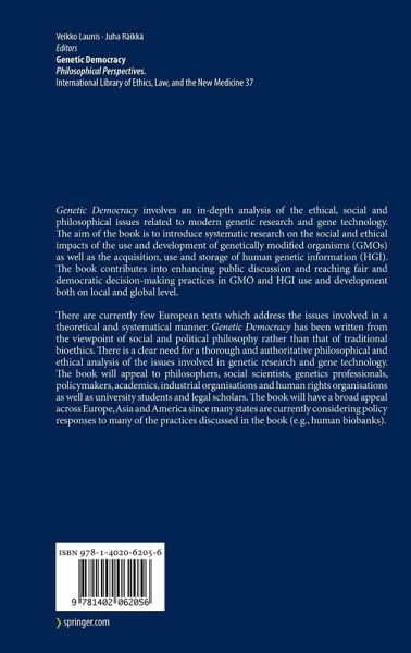 There are currently few European texts which address the issues involved in a theoretical and systematical manner. "Genetic Democracy" has been written from the viewpoint of social and political philosophy rather than that of traditional bioethics. There is a clear need for a throughout and authoritative philosophical and ethical analysis of the issues involved in genetic research and gene technology. The bookwill appeal to philosophers, social scientists, genetics professionals, policy makers, academics, industrial organisations and human rights organisations as well as university students and legal scholars. The book will have a broad appeal across Europe, Asia and America since many states are currently considering policy responses to many of the practices discussed in the books (e.g., human biobanks).