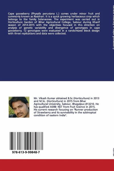 Cape gooseberry (Physalis peruviana L.) comes under minor fruit and commonly known as Rasbhari. It is a quick growing herbaceous crop which belongs to the family Solanaceae. The experiment was carried out in Horticulture Garden of Bihar Agricultural College, Sabour during Kharif season of 2014-2015 with the objectives focused in this direction on analysis of genetic variability and divergence of genotypes in cape gooseberry. 12 genotypes were evaluated in a randomized block design with three replications and data were collected.