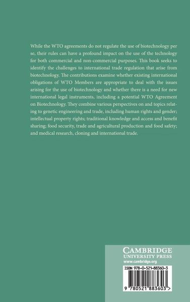 While the WTO agreements do not regulate the use of biotechnology per se, their rules can have a profound impact on the use of the technology for both commercial and non-commercial purposes. This book seeks to identify the challenges to international trade regulation that arise from biotechnology. The contributions examine whether existing international obligations of WTO Members are appropriate to deal with the issues arising for the use of biotechnology and whether there is a need for new international legal instruments, including a potential WTO Agreement on Biotechnology. They combine various perspectives on and topics relating to genetic engineering and trade, including human rights and gender; intellectual property rights; traditional knowledge and access and benefit sharing; food security, trade and agricultural production and food safety; and medical research, cloning and international trade.