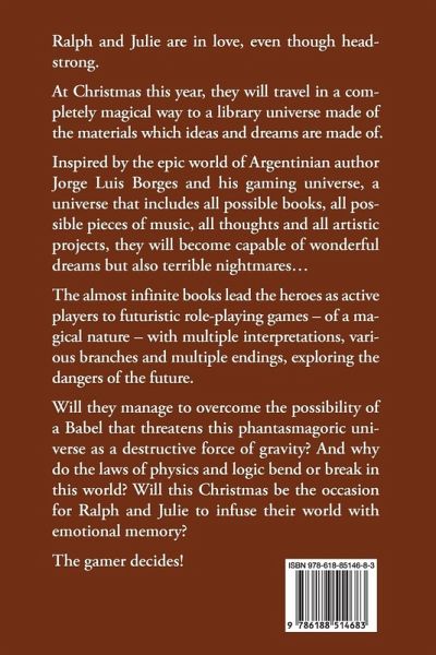 Ralph and Julie are in love, even though headstrong. At Christmas this year, they will travel in a completely magical way to a library universe made of the materials which ideas and dreams are made of. Inspired by the epic world of Argentinian author Jorge Luis Borges and his gaming universe, a universe that includes all possible books, all possible pieces of music, all thoughts and all artistic projects, they will become capable of wonderful dreams but also terrible nightmares...The almost infinite books lead the heroes as active players to futuristic role-playing games - of a magical nature - with multiple interpretations, various branches and multiple endings, exploring the dangers of the future. Will they manage to overcome the possibility of a Babel that threatens this phantasmagoric universe as a destructive force of gravity? And why do the laws of physics and logic bend or break in this world? Will this Christmas be the occasion for Ralph and Julie to infuse their world with emotional memory? The gamer decides!An illustrated epic science fantasy novella for all ages above 16 years old.
