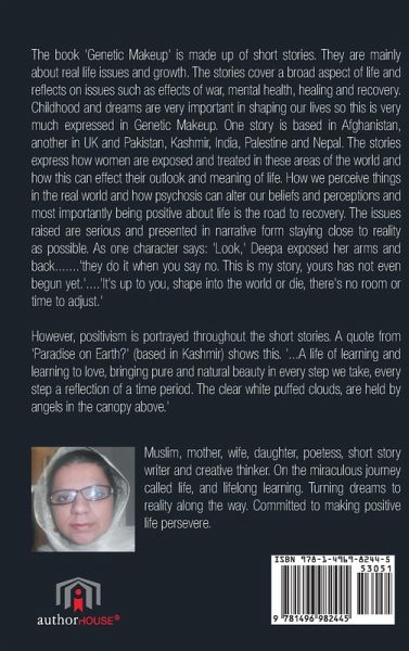 The book 'Genetic Makeup' is made up of short stories. They are mainly about real life issues and growth. The stories cover a broad aspect of life and reflects on issues such as effects of war, mental health, healing and recovery. Childhood and dreams are very important in shaping our lives so this is very much expressed in Genetic Makeup. One story is based in Afghanistan, another in UK and Pakistan, Kashmir, India, Palestine and Nepal. The stories express how women are exposed and treated in these areas of the world and how this can effect their outlook and meaning of life. How we perceive things in the real world and how psychosis can alter our beliefs and perceptions and most importantly being positive about life is the road to recovery. The issues raised are serious and presented in narrative form staying close to reality as possible. As one character says: 'Look,' Deepa exposed her arms and back...'they do it when you say no. This is my story, yours has not even begun yet.'...'It's up to you, shape into the world or die, there's no room or time to adjust.' However, positivism is portrayed throughout the short stories. A quote from 'Paradise on Earth?' (based in Kashmir) shows this. '...A life of learning and learning to love, bringing pure and natural beauty in every step we take, every step a reflection of a time period. The clear white puffed clouds, are held by angels in the canopy above.'