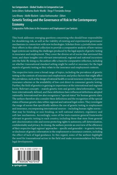 The respective texts cover a broad range of topics, including the prevalence of genetic testing in the contextsof insurance and employment, and policy factors that might affect this prevalence, such as the design of national health or social insurance systems, of private insurance schemes or the availability of low-cost direct-to-consumer genetic testing. Further, the field of genetics is gaining in importance at the international and regional levels. Relevant concepts - mainly genetic tests and genetic data/information - have been internationally defined, and these definitions have influenced definitions adopted nationally. International law also recognizes a "special status" for human genetic data. The authors therefore also consider these definitions and the recognition of the special status of human genetic data within regional and national legal orders. They investigate the range of norms that specifically address the use of genetic testing in employment and insurance, encompassing international sources - including human rights norms - that may be binding or non-binding, as well national statutory, regulatory and soft-law mechanisms. Accordingly, some of the texts examine general frameworks relevant to genetic testing in each country, including those that stem from general anti-discrimination rules and norms protecting rights to autonomy, self-determination, confidentiality and privacy. In closing, the authors provide an overview of the efficiency of their respective legal regimes' approaches - specific and generalist - to genetic testing or disclosure of genetic information in the employment or insurance contexts, including the effect of lack of legal guidance. In this regard, some of the authors highlight the need for transnational action in the field and make recommendation for future legal developments.