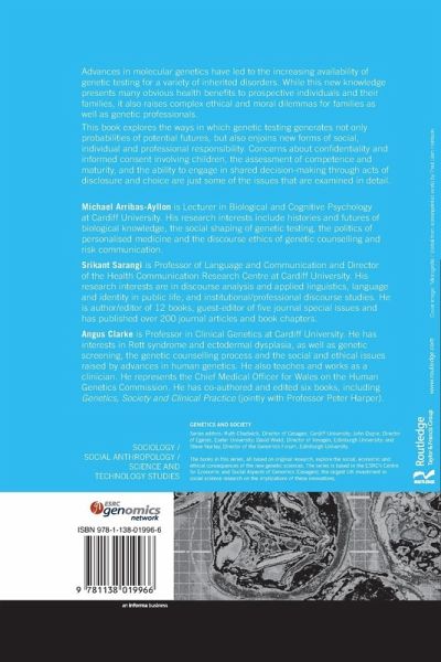 Michael Arribas-Ayllon is Lecturer in Biological and Cognitive Psychology at Cardiff University. His research interests include histories and futures of biological knowledge, the social shaping of genetic testing, the politics of personalised medicine and the discourse ethics of genetic counselling and risk communication. Srikant Sarangi is Professor of Language and Communication and Director of the Health Communication Research Centre at Cardiff University. His research interests are in discourse analysis and applied linguistics, language and identity in public life, and institutional/professional discourse studies. He is author/editor of 12 books, guest-editor of five journal special issues and has published over 200 journal articles and book chapters. Angus Clarke is Professor in Clinical Genetics in Cardiff University. He has interests in Rett syndrome and ectodermal dysplasia, as well as genetic screening, the genetic counselling process and the social and ethical issues raised by advances in human genetics. He also teaches and works as a clinician. He represents the Chief Medical Officer for Wales on the Human Genetics Commission. He has co-authored and edited six books, including Genetics, Society and Clinical Practice (jointly with Professor Peter Harper).