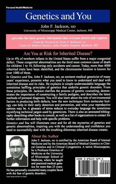 In Genetics and You, John F. Jackson, MD, an eminent medical geneticist of many years' experience, presents everything you need to know to understand and deal with inherited disease and its risks. He explains in simple understandable language the sometimes baffling principles of genetics that underlie genetic disorders. From these principles, Dr. Jackson clarifies the process of genetic counseling, demonstrates the importance of constructing a family pedigree, and describes the latest methods of prenatal diagnosis. You will also learn about the role of environmental factors in producing birth defects, how the new techniques from molecular biology can help in their early detection and prevention, and what your reproductive options may be. A glossary of terms reduces to everyday language the sometimes mystifying technical jargon used by geneticists. There is also an annotated bibliography describing other books to consult, as well as a list of organizations to contact for further information and help with specific problems.