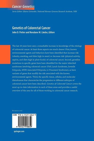 Epidemiology and Models of Colorectal Cancer.- Colorectal Cancer: Epidemiology.- Mouse Models of Intestinal Cancer.- Pathways to Colorectal Cancer.- The Chromosomal-Instability Pathway and APC Gene Mutation in Colorectal Cancer.- DNA Methylation in Colorectal Cancer: Multiple Facets of Tumorigenesis.- Pathways and Pathology.- Germline Susceptibility - Mendelian and Other Syndromes.- Familial Adenomatous Polyposis.- DNA Mismatch Repair and Lynch Syndrome.- Additional Syndromes with Hereditary Predisposition to Colorectal Cancer.- Familial Colorectal Cancer Type X.- Families with Serrated Neoplasia of the Colon.- Peutz-Jeghers Syndrome.- Juvenile Polyposis.- BLM Mutation and Colorectal Cancer Susceptibility.- The Role of p53 in Colorectal Cancer.- Chromosomes 8q24 and 9p24: Associations with Colorectal Cancer.- Germline Susceptibility - Gene-Environment Interactions.- Genetic Variability in Folate-Mediated One-Carbon Metabolism and Risk of Colorectal Neoplasia.- Genetic Variability in NSAID Targets and NSAID-Metabolizing Enzymes and Colorectal Neoplasia.- The Role of Chemical Carcinogens and Their Biotransformation in Colorectal Cancer.- Calcium and Vitamin D.