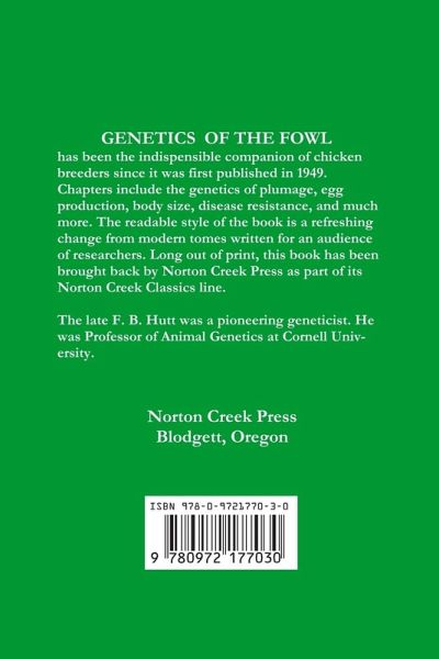 Genetics of the Fowl is still the most useful work on poultry genetics. Just the last chapter, "Genetics in Practice," provides the best introduction to successful poultry breeding ever written, covering the difference between breeding for dominant vs. recessive characteristics, individual selection vs. progeny testing, inbreeding vs. crossing, and much more. Professor Hutt was sympathetic to the needs of practical farmers, show breeders, and researchers, so this book is far more than a compendium of genes, and yet this aspect is covered in loving detail. Chapters include the genetics of plumage, egg production, body type, disease resistance, and much more, with many illustrations of how the genes work in practice. Other works have come and gone since Genetics of the Fowl'sfirst publication in 1947, but Genetics of the Fowl is still the first book everyone should read on poultry genetics. New information has come to light since its publication, but it builds upon the solid foundation laid down by Hutt. Genetics of the Fowl is volume 3 of the Norton Creek Classics series, and is an exact reproduction of the original edition. See http://www.nortoncreekpress.com for more of these classic poultry books. About the Author: Frederick Bruce Hutt's career in scientific writing began at age 8. At 35, he became the youngest president of the Poultry Science Association. He researched, taught, and wrote extensively. He published more than 250 papers and articles, some intended for audiences of farmers and poultry hobbyists and others intended for researchers and geneticists. His clear, well-organized style won him a warm welcome with all audiences.