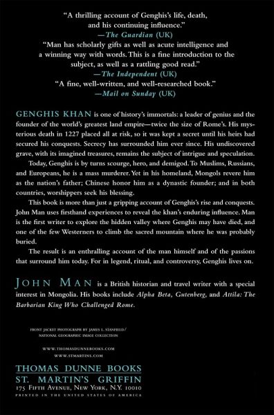 Genghis Khan is one of history's immortals, alive in memory as a scourge, hero, military genius and demi-god. To Muslims, Russians and westerners, he is a murderer of millions, a brutal oppressor. Yet in his homeland of Mongolia he is the revered father of the nation, and the Chinese honor him as the founder of a dynasty. In his so-called Mausoleum in Inner Mongolia, worshippers seek the blessing of his spirit. In a supreme paradox, the world's most ruthless conqueror has become a force for peace and reconciliation. As a teenager, Genghis was a fugitive, hiding from enemies on a remote mountainside. Yet he went on to found the world's greatest land empire and change the course of world history. Brilliant and original as well as ruthless, he ruled an empire twice the size of Rome's until his death in 1227 placed all at risk. To secure his conquests and then extend them, his heirs kept his death a secret, and secrecy has surrounded him ever since. His undiscovered grave, with its imagined treasures, remains the subject of intrigue and speculation. This is more than just a gripping account of Genghis' rise and conquests. John Man uses first-hand experiences in China and Mongolia to reveal the khan's enduring influence. He has traveled the length of the empire. He spotlights the tension between Mongols and Chinese, who both claim Genghis' spirit. He is the first writer to explore the hidden valley where Genghis is believed to have died, and one of the few westerners to climb the mountain where he was likely buried. This stunning narrative paints a vivid picture of the man himself, the places where he lived and fought, and the passions that surround him still. For in legend, ritual and intense controversy, Genghis lives on.