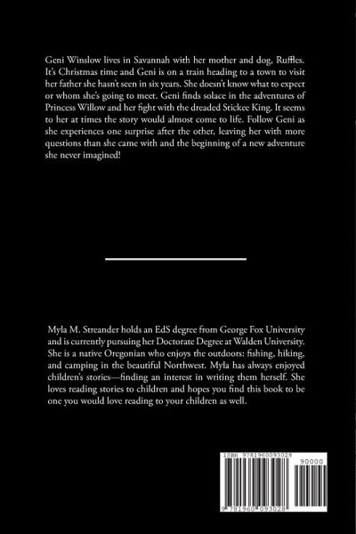 Geni Winslow lives in Savannah with her mother and dog, Ruffles. It's Christmas time and Geni is on a train heading to a town to visit her father she hasn't seen in six years. She doesn't know what to expect or who she's going to meet. Geni finds solace in the adventures of Princess Willow and her fight with the dreaded Stickee King. It seems to her at times the story would almost come to life. Follow Geni as she experiences one surprise after the other, leaving her with more questions than she came with and the beginning of a new adventure she never imagined!