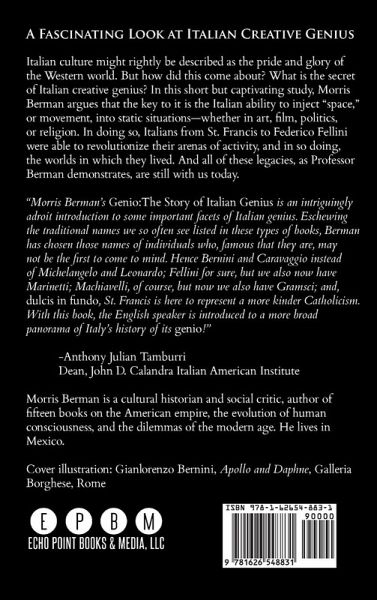 Italian culture might rightly be described as the pride and glory of the Western world. But how did this come about? What is the secret of Italian creative genius? In this short but captivating study (complete with 21 illustrations, 14 in color), Morris Berman argues that the key to it is the Italian ability to inject "space," or movement, into static situations--whether in art, film, politics, or religion. In doing so, Italians from St. Francis to Federico Fellini were able to revolutionize their arenas of activity, and in so doing, the worlds in which they lived. And all of these legacies, as Professor Berman demonstrates, are still with us today. "Morris Berman’s Genio: The Story of Italian Genius is an intriguingly adroit introduction to some important facets of Italian genius. Eschewing the traditional names we so often see listed in these types of books, Berman has chosen those names of individuals who, famous that they are, may not be the first to come to mind. Hence Bernini and Caravaggio instead of Michelangelo and Leonardo; Fellini for sure, but we also now have Marinetti; Machiavelli, of course, but now we also have Gramsci; and, dulcis in fundo, St. Francis is here to represent a more kinder Catholicism. With this book, the English speaker is introduced to a more broad panorama of Italy’s history of its genio!" -Anthony Julian Tamburri, Dean, John D. Calandra Italian American Institute Other engaging works by Morris Berman include: Spinning Straw Into Gold: Straight Talk for Troubled Times (one man's meditation on the meaning of his life to date); Coming to Our Senses (a provocative analysis of the relationship between culture, mind, and body in the history of Western society), and Are We There Yet? (which analyzes what has gone wrong with the United States since its inception, and the problems we now face as a result).