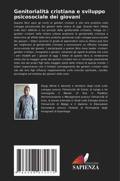 Questo libro apre gli occhi ai genitori cristiani e alle loro pratiche sullo sviluppo psicosociale dei giovani nelle chiese di oggi. Questo libro riflette sulle basi bibliche e sui principi della genitorialità cristiana, indaga se i genitori cristiani nelle chiese urbane praticano la genitorialità cristiana e determina gli effetti delle loro pratiche genitoriali sullo sviluppo psico-sociale dei giovani; i lettori saranno in grado di apprendere cosa la chiesa può fare per migliorare la genitorialità cristiana e promuovere un efficace sviluppo psico-sociale dei giovani. I partecipanti a questo libro sono leader cristiani, genitori cristiani, insegnanti e giovani, compresi gli agenti di polizia che sono i veri modelli per i giovani di oggi. I lettori di questo libro si renderanno conto che la maggior parte dei genitori cristiani non si coinvolge pienamente nella vita dei propri figli nella maggior parte delle chiese di questo mondo. I lettori impareranno che il limitato coinvolgimento dei genitori cristiani nella vita dei loro figli influisce negativamente sulla crescita spirituale, sociale, psicologica ed emotiva dei giovani nelle case.