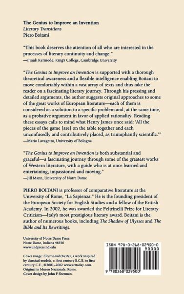 The Genius to Improve an Invention derives its title from John Dryden's phrase for the British tendency to take up literary masterpieces from the past and "perfect" them. Distinguished literary scholar Piero Boitani adopts Dryden's notion as a framework for exploring ways in which classical and medieval texts, scenes, and themes have been rewritten by modern authors. Boitani focuses on a concept of literary transition that takes into account both T.S. Eliot's idea of "tradition and individual talent" and Harold Bloom's "anxiety of influence." In five elegant essays he examines a wide range of authors and texts, including Aeschylus, Sophocles, Euripides, Shakespeare, Chaucer, Voltaire, Goethe, Sartre, Dante, and Keats. Appearing for the first time in an English translation, The Genius to Improve an Invention will appeal to anyone interested in the Western literary tradition.