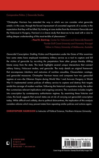 Genocidal Conscription identifies a previously underexamined method by which two states, the Ottoman Empire in World War One and Axis-era Hungary during World War Two, used conscription – mandatory military service – to commit genocide under the guise of war. The book addresses implications and analyzes contemporary issues in authoritarian regimes.