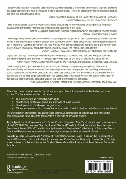 Foreword. Helen Fein 1. Introduction: Genocide Matters. Ongoing Issues and Emerging Perspectives Joyce Apsel and Ernesto Verdeja 2. Questioning Boundaries: What's Old and What's New in Comparative Genocide Theory Maureen Hiebert 3. Critical Genocide Studies Alex Hinton 4. Holocaust Studies and Genocide Studies: Past, Present and Future Donald Bloxham 5. Genocide and the Politics of Rape: Historical and Psychological Perspectives Roger W. Smith 6. Genocide by Attrition: Silent and Efficient Sheri P. Rosenberg and Everita Silina 7. Research and Teaching About Genocide: History, Challenges and New Directions Joyce Apsel 8. Humanitarian Military Intervention After the Responsibility to Protect: Obstacles and Prospects Paul D. Williams 9. Transitional Justice and Genocide Ernesto Verdeja