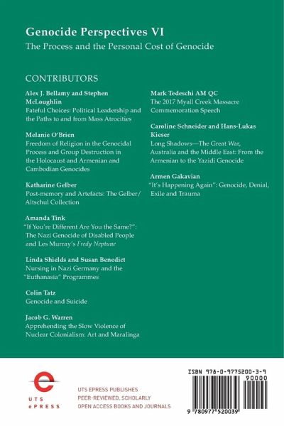 Genocide Perspectives VI grapples with two core themes: the personal toll of genocide, and processes that facilitate the crime. From political choices governments and leaders make, through to denialism and impunity, the crime of genocide recurs again and again, across the globe. At what cost to individuals and communities? What might the legacy of this criminality be? This collection of essays examines the personal sacrifice genocide takes from those who live through the trauma, and the generations that follow. Contributors speak to the way visual art and literature attempt to represent genocide, hoping to make sense of problematic histories while also offering a means of reflection after years of "slow violence" or silenced memories. Some authors generously allow us into their own histories, or contemplate how they may have experienced genocide had they been born in another time or place. What facets contribute to the processes that lead to, or enable the crime of genocide? This collection explores those processes through a variety of case studies and lenses. How do nurses, whose role is inherently linked to care and compassion, become mass killers? How do restrictions on religious freedom play a role in advancing genocidal policies, and why do perpetrators of genocide often target religious leaders? Why is it so important for Australia and other nations with histories of colonial genocide to acknowledge their past? Among the essays published in this volume, we have the privilege and the sorrow of publishing the very last essay Professor Colin Tatz wrote before his passing in 2019. His contribution reveals, yet again, the enormous influence of both his research and his original ideas on genocide. He reflects on continuing legacies for Indigenous Australian communities, with whom he worked for many decades, and adds nuance to contemporary understanding of the Armenian Genocide and the Holocaust, two other cases to which he was deeply committed.