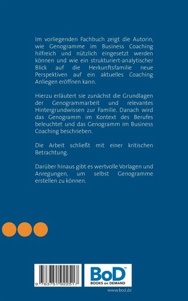 Im vorliegenden Fachbuch zeigt die Autorin, wie Genogramme im Business Coaching hilfreich und nützlich eingesetzt werden können und wie ein strukturiert-analytischer Blick auf die Herkunftsfamilie neue Perspektiven auf ein aktuelles Coaching Anliegen eröffnen kann. Hierzu erläutert sie zunächst die Grundlagen der Genogrammarbeit und relevantes Hintergrundwissen zur Familie. Danach wird das Genogramm im Kontext des Berufes beleuchtet und das Genogramm im Business Coaching beschrieben. Die Arbeit schließt mit einer kritischen Betrachtung.Darüber hinaus gibt es wertvolle Vorlagen und Anregungen, um selbst Genogramme erstellen zu können.