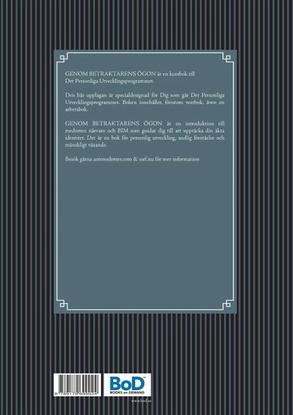 GENOM BETRAKTARENS ÖGON är en kursbok till Det Personliga Utvecklingsprogrammet. Den här upplagan är specialdesignad för Dig som går Det Personliga Utvecklingsprogrammet. Boken innehåller, förutom textbok, även en arbetsbok. GENOM BETRAKTARENS ÖGON är en introduktion till medveten närvaro och BIM som guidar dig till att upptäcka din äkta identitet. Det är en bok för personlig utveckling, andlig förståelse och mänskligt växande. Besök gärna antonsdotter.com & ssrf.nu för mer information