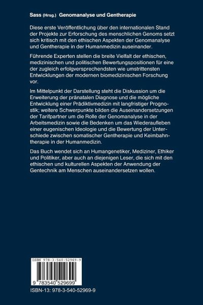 Diese erste Veröffentlichung über den Stand der Projekte zur Erforschung des menschlichen Genoms setzt sich kritisch mit den ethischen Aspekten der Genomanalyse und Gentherapie in der Humanmedizin auseinander. Führende Experten stellen die breite Vielfalt der ethischen, medizinischen und politischen Bewertungspositionen für eine der erfolgversprechendsten und umstrittensten Entwicklungen der modernen biomedizinischen Forschung vor. Im Mittelpunkt der Darstellung steht die Diskussion um die Erweiterung der pränatalen Diagnose und die mögliche Entwicklung einer Prädiktivmedizin mit langfristiger Prognostik; weitere Schwerpunkte bilden die Auseinandersetzungen der Tarifpartner um die Rolle der Genomanalyse in der Arbeitsmedizin sowie die Bedenken um das Wiederaufleben einer eugenischen Ideologie und die Bewertung der Unterschiede zwischen somatischer Gentherapie und Keimbahntherapie in der Humanmedizin. Das Buch wendet sich vor allem an Forscher, Ethiker und Politiker, aber auch an diejenigen Leser, die sich mit den ethischen und kulturellen Aspekten der Anwendung der Gentechnik am Menschen auseinandersetzen wollen.