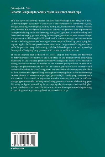 The nine chapters each dedicated to a cereal crop in this volumeare deliberate on different types of abiotic stresses and their effects on and interaction with crop plants; enumerate on the available genetic diversity with regard to abiotic stress resistance among available cultivars; illuminate on the potential gene pools for utilization in interspecific gene transfer; are brief on the classical genetics of stress resistance and traditional breeding for transferring them to their cultivated counterparts; elucidate on the success stories of genetic engineering for developing abiotic stress-resistant crop varieties; discuss on molecular mapping of genes and QTLs underlying stress resistance and their marker-assisted introgression into elite varieties; enunciate on different emerging genomics-aided techniques including genomic selection, allele mining, gene discovery, and gene pyramiding for developing adaptive crop varieties with higher quantity and quality, and also elaborate some case studies on genome editing focusing on specific genesfor generating abiotic stress-resistant crops.