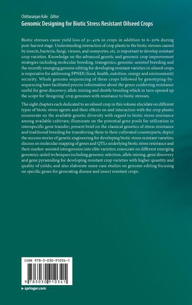 The eight chapters each dedicated to an oilseed crop in this volume elucidate on different types of biotic stress agents and their effects on and interaction with the crop plants; enumerate on the available genetic diversity with regard to biotic stress resistance among available cultivars; illuminate on the potential gene pools for utilization in interspecific gene transfer; present brief on the classical genetics of stress resistance and traditional breeding for transferring them to their cultivated counterparts; depict the success stories of genetic engineering for developing biotic stress resistant varieties; discuss on molecular mapping of genes and QTLs underlying biotic stress resistance and their marker-assisted introgression into elite varieties; enunciate on different emerging genomics-aided techniques including genomic selection, allele mining, gene discovery and gene pyramiding for developing resistant crop varieties with higher quantity and quality of yields; and also elaborate some case studies on genome editing focusing on specific genes for generating disease and insect resistant crops.