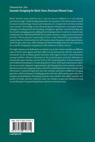 The eight chapters each dedicated to an oilseed crop in this volume elucidate on different types of biotic stress agents and their effects on and interaction with the crop plants; enumerate on the available genetic diversity with regard to biotic stress resistance among available cultivars; illuminate on the potential gene pools for utilization in interspecific gene transfer; present brief on the classical genetics of stress resistance and traditional breeding for transferring them to their cultivated counterparts; depict the success stories of genetic engineering for developing biotic stress resistant varieties; discuss on molecular mapping of genes and QTLs underlying biotic stress resistance and their marker-assisted introgression into elite varieties; enunciate on different emerging genomics-aided techniques including genomic selection, allele mining, gene discovery and gene pyramiding for developing resistant crop varieties with higher quantity and quality of yields; and also elaborate some case studies on genome editing focusing on specific genes for generating disease and insect resistant crops.