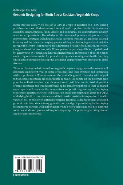 The nine chapters each dedicated to a vegetable crop or crop-group in this volume will deliberate on different types of biotic stress agents and their effects on and interaction with crop plants; will enumerate on the available genetic diversity with regard to biotic stress resistance among available cultivars; illuminate on the potential gene pools for utilization in interspecific gene transfer; will brief on the classical genetics of stress resistance and traditional breeding for transferring them to their cultivated counterparts; will enunciate the success stories of genetic engineering for developing biotic stress resistant varieties; will discuss on molecular mapping of genes and QTLs underlying biotic stress resistance and their marker-assisted introgression into elite varieties; will enunciate on different emerging genomics-aided techniques including genomic selection, allele mining, gene discovery and gene pyramiding for developing resistant crop varieties with higher quantity and better quality; and will also elaborate some casestudies ongenome editing focusing on specific genes for generating disease and insect resistant crops.