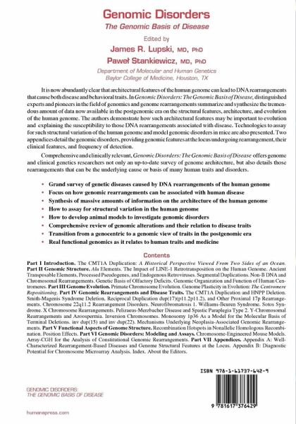 Comprehensive and clinically relevant, Genomic Disorders: The Genomic Basis of Disease offers genome and clinical genetics researchers not only an up-to-date survey of genome architecture, but also details those rearrangements that can be the underlying cause or basis of many human traits and disorders.