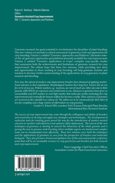 Genomics research has great potential to revolutionize the discipline of plant breeding. This two-volume set provides a critical assessment of genomics tools and approaches for crop breeding. Volume 1, entitled "Genomics Approaches and Platforms", illustrates state-of-the-art genomics approaches and platforms presently available for crop improvement. Volume 2, entitled "Genomics Applications in Crops", compiles crop-specific studies that summarize both the achievements and limitations of genomics research for crop improvement. We hope that these two volumes, while providing new ideas and opportunities to those working in crop breeding, will help graduate students and teachers to develop a better understanding of the applications of crop genomics to plant research and breeding