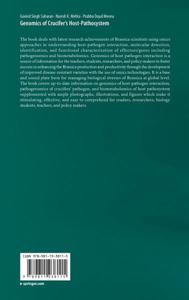 The book deals with latest research achievements of Brassica scientists using omics approaches in understanding host-pathogen interaction, molecular detection, identification, and functional characterization of effectors/genes including pathogenomics and biometabolomics. Genomics of host-pathogen interaction is a source of information for the teachers, students, researchers, and policy makers to foster success in enhancing the Brassica production and productivity through the development of improved disease-resistant varieties with the use of omics technologies. It is a base and sound plate form for managing biological stresses of Brassica at global level. The book covers up-to-date information on genomics of host-pathogen interaction, pathogenomics of crucifers' pathogen, and biometabolomics of host pathosystem supplemented with ample photographs, illustrations, and figures which make it stimulating, effective, and easy to comprehend for readers, researchers, biology students, teachers, and policy makers.