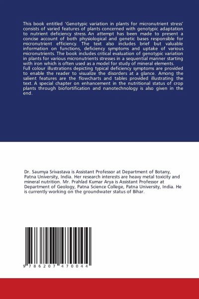 This book entitled 'Genotypic variation in plants for micronutrient stress' consists of varied features of plants concerned with genotypic adaptation to nutrient deficiency stress. An attempt has been made to present a concise account of both physiological and genetic bases responsible for micronutrient efficiency. The text also includes brief but valuable information on functions, deficiency symptoms and uptake of various micronutrients. The book includes critical evaluation of genotypic variation in plants for various micronutrients stresses in a sequential manner starting with iron which is often used as a model for study of mineral elements. Full colour illustrations depicting typical deficiency symptoms are provided to enable the reader to visualize the disorders at a glance. Among the salient features are the flowcharts and tables provided illustrating the text. A special chapter on enhancement in the nutritional status of crop plants through biofortification and nanotechnology is also given in the end.