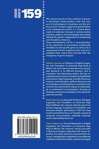 This volume focuses on the evolution of genres in specialized communication under the pressure of technological innovations and the profound social changes triggered by globalization in the contemporary world, in a context where rapid and extensive changes in communicative practices, patterns and technologies have deeply affected the generic configuration of professional and disciplinary domains.