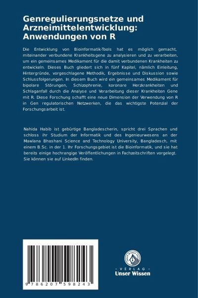 Die Entwicklung von Bioinformatik-Tools hat es möglich gemacht, miteinander verbundene Krankheitsgene zu analysieren und zu verarbeiten, um ein gemeinsames Medikament für die damit verbundenen Krankheiten zu entwickeln. Dieses Buch gliedert sich in fünf Kapitel, nämlich Einleitung, Hintergründe, vorgeschlagene Methodik, Ergebnisse und Diskussion sowie Schlussfolgerungen. In diesem Buch wird ein gemeinsames Medikament für bipolare Störungen, Schizophrenie, koronare Herzkrankheiten und Schlaganfall durch die Analyse und Verarbeitung dieser Krankheiten Gene mit R. Diese Forschung schafft eine neue Dimension der Verwendung von R in Gen regulatorischen Netzwerken, die das wichtigste Potenzial der Forschungsarbeit ist.