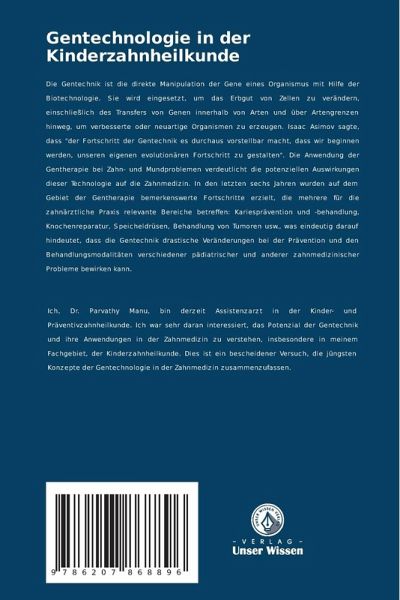 Die Gentechnik ist die direkte Manipulation der Gene eines Organismus mit Hilfe der Biotechnologie. Sie wird eingesetzt, um das Erbgut von Zellen zu verändern, einschließlich des Transfers von Genen innerhalb von Arten und über Artengrenzen hinweg, um verbesserte oder neuartige Organismen zu erzeugen. Isaac Asimov sagte, dass "der Fortschritt der Gentechnik es durchaus vorstellbar macht, dass wir beginnen werden, unseren eigenen evolutionären Fortschritt zu gestalten". Die Anwendung der Gentherapie bei Zahn- und Mundproblemen verdeutlicht die potenziellen Auswirkungen dieser Technologie auf die Zahnmedizin. In den letzten sechs Jahren wurden auf dem Gebiet der Gentherapie bemerkenswerte Fortschritte erzielt, die mehrere für die zahnärztliche Praxis relevante Bereiche betreffen: Kariesprävention und -behandlung, Knochenreparatur, Speicheldrüsen, Behandlung von Tumoren usw., was eindeutig darauf hindeutet, dass die Gentechnik drastische Veränderungen bei der Prävention und den Behandlungsmodalitäten verschiedener pädiatrischer und anderer zahnmedizinischer Probleme bewirken kann.
