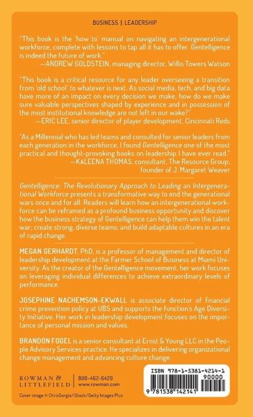 No one needs another book about how to lead Millennialsà â â what we need is a book about harnessing the untapped potential from the diversity of thought in a multigenerational workforce. Gentelligence is that book. It presents a transformative way to end the generational wars once and for all.