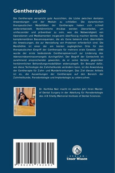 Die Gentherapie verspricht gute Aussichten, die Lücke zwischen dentalen Anwendungen und der Medizin zu schließen. Die dynamischen therapeutischen Modalitäten der Gentherapie haben sich schnell weiterentwickelt. Herkömmliche Ansätze werden überarbeitet, um umfassender und präventiver zu sein, was die Notwendigkeit von Operationen und Medikamenten insgesamt überflüssig machen könnte. Die komplementären Basensequenzen, die als Gene bekannt sind, übermitteln die Anweisungen, die zur Herstellung von Proteinen erforderlich sind. Die Mundhöhle ist einer der am besten zugänglichen Orte für den therapeutischen Eingriff der Gentherapie für mehrere orale Gewebe. 1990 wurde der erste bedeutende Gentherapieversuch zur Linderung des Adenosindeaminasemangels durchgeführt. Der Begriff der Gentechnik ist zunehmend ansprechender geworden, da er seine Vorteile gegenüber herkömmlichen Behandlungsmodalitäten widerspiegelt. Ein Beispiel dafür, wie diese Technologie die Zahnheilkunde verändern kann, ist die Anwendung der Gentherapie für Zahn- und Munderkrankungen. Das Ziel dieses Artikels ist es, die Auswirkungen der Gentherapie auf den Bereich der Zahnheilkunde, Parodontologie und Implantologie zu untersuchen.