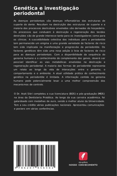 As doenças periodontais são doenças inflamatórias das estruturas de suporte do dente. Resultam na destruição das estruturas de suporte e a maioria dos processos destrutivos envolvidos são derivados do hospedeiro. Os processos que conduzem à destruição e regeneração dos tecidos destruídos são de grande interesse tanto para os investigadores como para os clínicos. A suscetibilidade selectiva dos indivíduos para a periodontite tem permanecido um enigma e uma grande variedade de factores de risco tem sido implicada na manifestação e progressão da periodontite. Os factores genéticos têm sido uma nova adição à lista de factores de risco para as doenças periodontais. Com a disponibilidade da sequência do genoma humano e o conhecimento do complemento dos genes, deverá ser possível identificar as vias metabólicas envolvidas na destruição e regeneração periodontal. A maioria das formas de periodontite representa um relato ao longo da vida de interacções entre o genoma, o comportamento e o ambiente. A atual utilidade prática do conhecimento genético na periodontite é limitada. A informação contida no genoma humano pode potencialmente levar a uma melhor compreensão dos mecanismos de controlo.