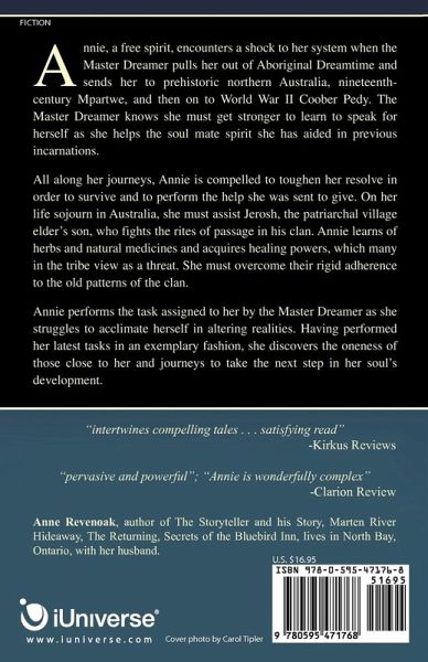 Annie, a free spirit, encounters a shock to her system when the Master Dreamer pulls her out of Aboriginal Dreamtime and sends her to prehistoric northern Australia, nineteenth-century Mpartwe, and then on to World War II Coober Pedy. The Master Dreamer knows she must get stronger to learn to speak for herself as she helps the soul mate spirit she has aided in previous incarnations. All along her journeys, Annie is compelled to toughen her resolve in order to survive and to perform the help she was sent to give. On her life sojourn in Australia, she must assist Jerosh, the patriarchal village elder's son, who fights the rites of passage in his clan. Annie learns of herbs and natural medicines and acquires healing powers, which many in the tribe view as a threat. She must overcome their rigid adherence to the old patterns of the clan. Annie performs the task assigned to her by the Master Dreamer as she struggles to acclimate herself in altering realities. Having performed her latest tasks in an exemplary fashion, she discovers the oneness of those close to her and journeys to take the next step in her soul's development.