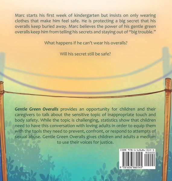 Marc starts his first week of kindergarten but insists on only wearing clothes that make him feel safe. He is protecting a big secret that his overalls keep buried away. Marc believes the power of his gentle green overalls keep him from telling his secrets and staying out of "big trouble." What happens if he can't wear his overalls? Will his secret still be safe? Gentle Green Overalls provides an opportunity for children and their caregivers to talk about the sensitive topic of inappropriate touch and body safety. While the topic is challenging, statistics show that children need this conversation with loving adults to equip them with the tools they need to prevent, confront, or respond to attempts of sexual abuse. Gentle Green Overalls gives children and adults a medium to use their voices for justice.