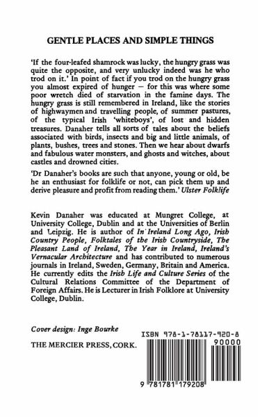 'If the four-leafed shamrock was lucky, the hungry grass who quite the opposite, and very unlucky he who trod on it.' In point of fact if you trod on the hungry grass you almost expired of hunger -- for this is where some poor wretch died of starvation in the famine days. The hungry grass is still remembered in Ireland, like the stories of highwaymen and travelling people, of summer pastures, of the typical Irish 'whiteboys, of lost and hidden treasures. Danaher tells all sorts of tales about the beliefs associated with birds, insects and big and little animals, of plants, bushes, trees and stones. Then we hear about dwarfs and fabulous water monsters, and ghosts and witches, about castles and drowned cities.