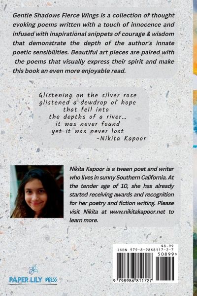 Award-winning writer, publisher, poet, and Mensa member pens inspirational poetry book...at just ten years old! The author, Nikita Kapoor, received the Award of Excellence in Reflections Competitions in the Literature Category, for her poem, Your Opinion Matters, that is featured in this thought-provoking poetry book. Gentle Shadows Fierce Wings is a collection of thought-evoking poems written with a touch of innocence and infused with inspirational snippets of courage & wisdom that demonstrate the depth of the author's innate poetic sensibilities. Beautiful art pieces are paired with the poems that visually express their spirit and make this book an even more enjoyable read.