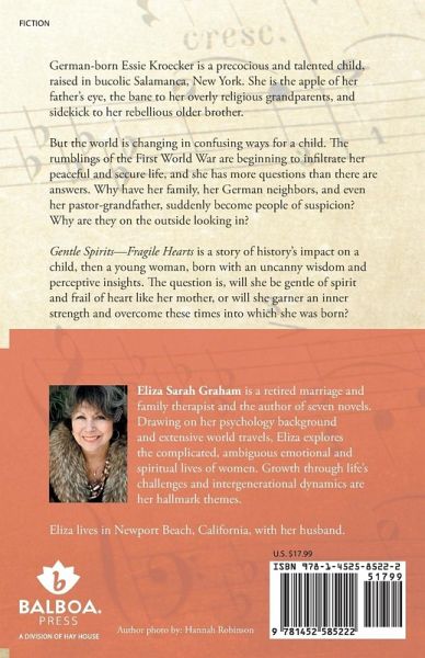 German-born Essie Kroecker is a precocious and talented child, raised in bucolic Salamanca, New York. She is the apple of her father's eye, the bane to her overly religious grandparents, and sidekick to her rebellious older brother. But the world is changing in confusing ways for a child. The rumblings of the First World War are beginning to infiltrate her peaceful and secure life, and she has more questions than there are answers. Why have her family, her German neighbors, and even her pastor-grandfather, suddenly become people of suspicion? Why are they on the outside looking in? Gentle Spirits-Fragile Hearts is a story of history's impact on a child, then a young woman, born with an uncanny wisdom and perceptive insights. The question is, will she be gentle of spirit and frail of heart like her mother, or will she garner an inner strength and overcome these times into which she was born?
